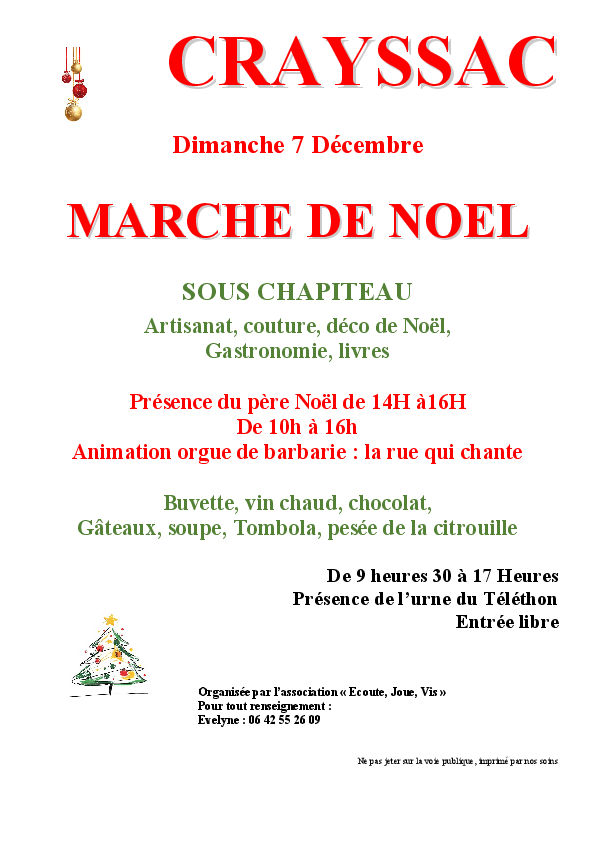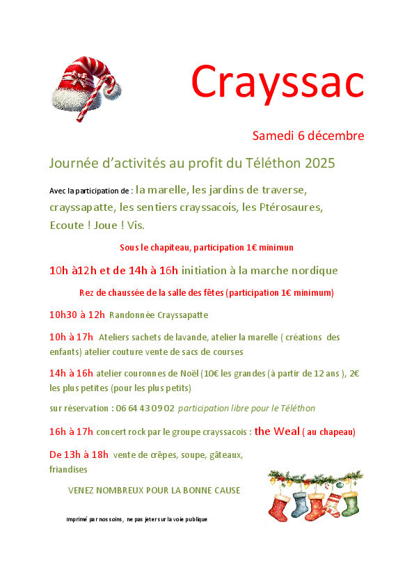 Le samedi 6 décembre les associations du village se groupent pour la journée Téléthon. Les Ptérosaures couture, les jardins de traverse, les sentiers crayssacois, Crayssapatte, la marelle, Ecoute! Joue! Vis! vous attendent à la salle des fêtes et sous le chapiteau pour vous proposer des activités pour les enfants et les grands enfants. Initiation marche nordique de 10hà 12h et de 14h à 16h, randonnée pédestre autour de Crayssac en fonction de la météo de 10h30 à 12H, des ateliers déco de Noël avec les enfants, atelier sachets de lavande et vente de crêpes, soupes, gâteaux, boissons chaudes, friandises.